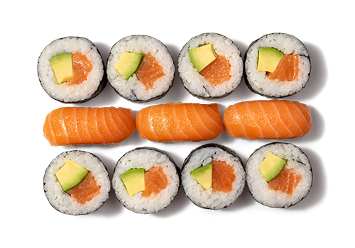 Sushi: 3x Nigiri mit Lachs; 8x Futo mit Lachs und Avocado.